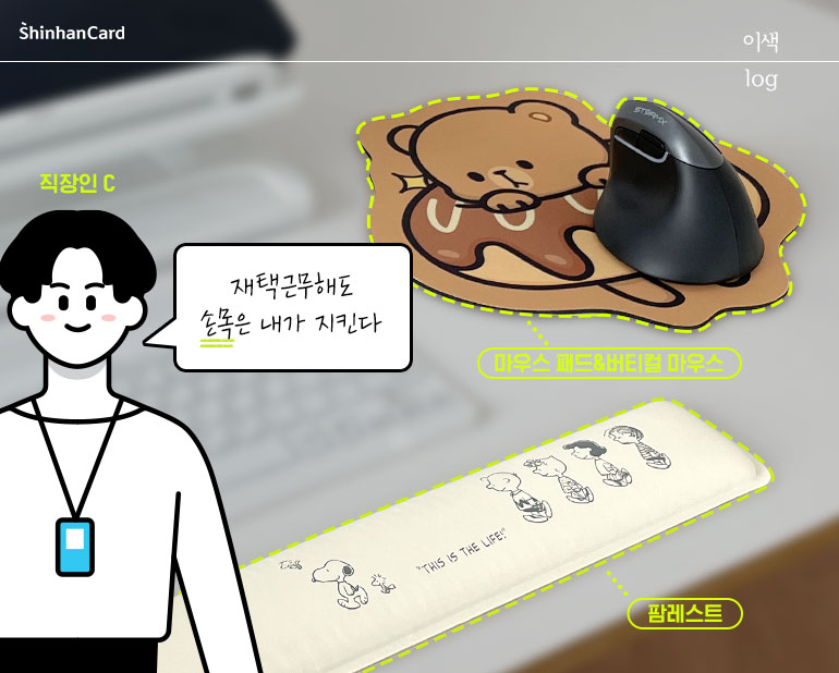 직장인 C : 보통 직장인들이 목과 허리디스크를 걱정하지만, 저는 손목 보호에 신경 쓰는 편이에요. 인체 공학적으로 설계되어 있어 일반 마우스보다는 피로감이 덜하고 작업 능률을 상승시켜 주는 ‘버티컬 마우스’, 여기에 손목 받침대가 장착된 마우스 패드까지 사용하면 금상첨화죠! 손목이 꺾이지 않도록 도와주는 키보드 받침대 ‘팜레스트’도 짝꿍처럼 애용하고 있답니다.