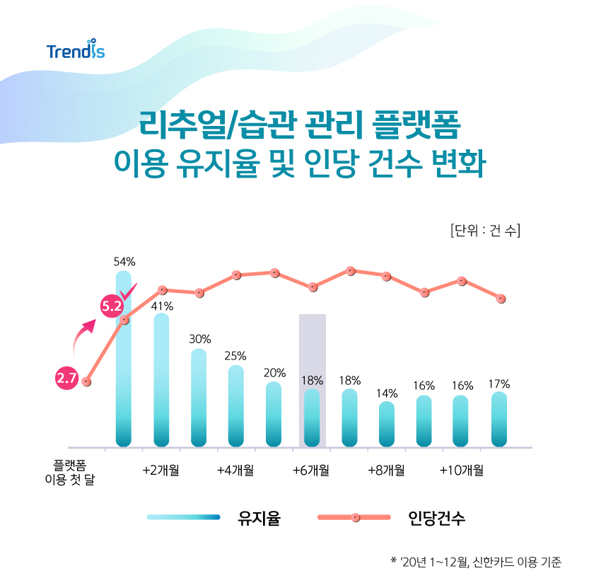 그렇다면 랜선으로 개인의 리추얼을 공유, 실천해나가는 플랫폼은 얼마나 자주 이용되고 있을까요? 지난 3개월간 리추얼/습관 관리 플랫폼을 2회 이상 이용한 고객은 전체의 52%로 1회만 이용한 고객 대비 4% p 많았습니다. 뿐만 아니라 첫 달 결제 이후 6개월이 지나면 이용이 일정 수준 이상으로 유지되는 모습이 나타났고요. 인당 건수의 경우, 두 번째 이용 월부터 첫 달 배지 2배에 가까운 모습으로 증가해 한 번의 성공, 성취감을 느낀 고객은 해당 플랫폼에 대한 신뢰와 충성도가 높아짐을 확인할 수 있었습니다.