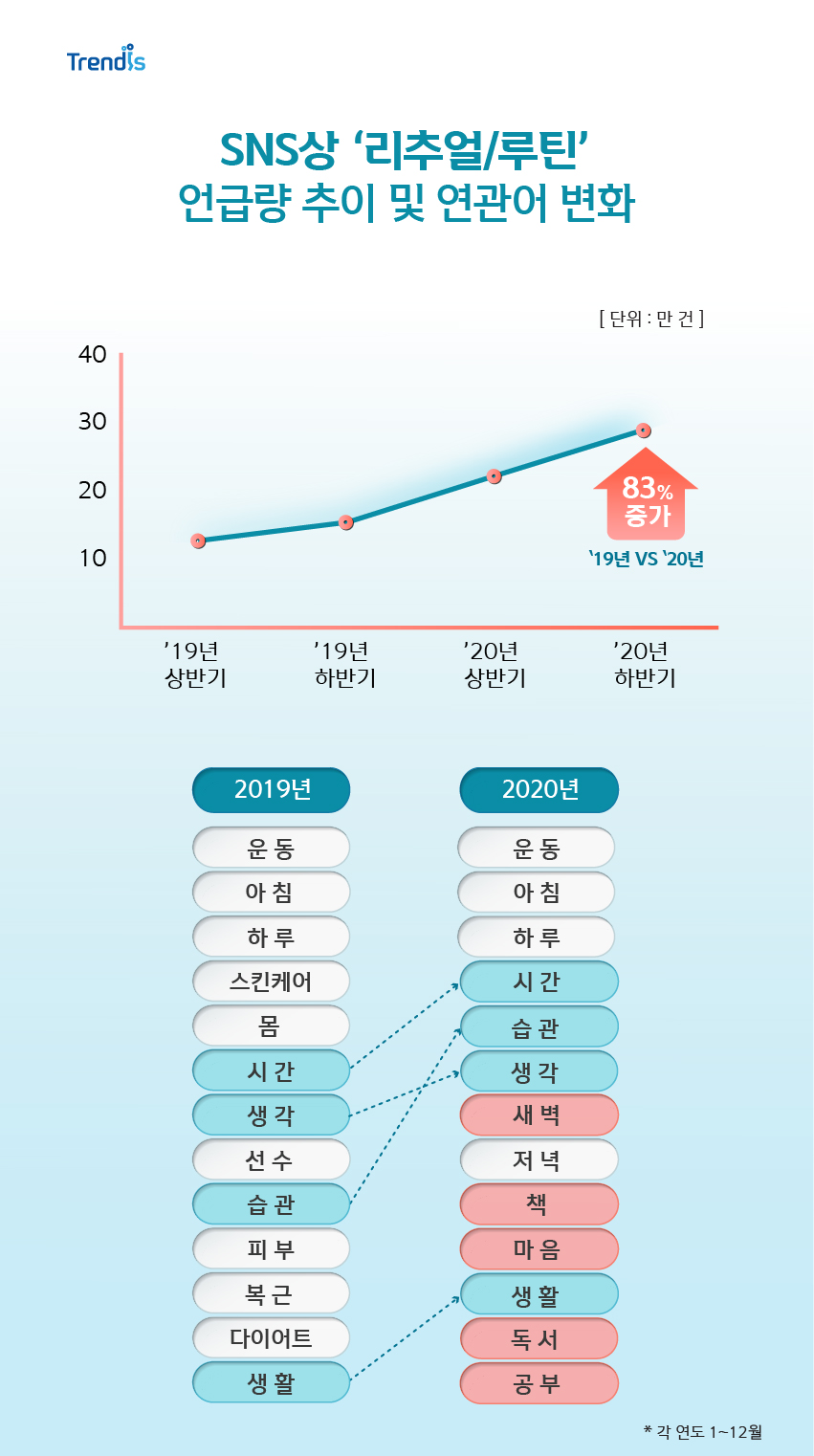 작년 한 해 언급량이 꾸준히 늘어나며 약 83%의 증가율을 보였습니다. 연관어 변화를 통해선 과거 대비 리추얼/루틴을 실천하는 모습이 조금씩 달라지고 있음을 알 수 있는데요. 조금 이른 기상으로 자투리 새벽 시간을 효율적으로 활용하기도 하고요. 과거의 다이어트/피부/복근 등 외모 관리 중심에서 독서/마음 등 내면을 케어하거나, 공부/생활 등 일상의 활동을 보다 생산적으로 가꾸려는 움직임이 나타나고 있습니다. 코로나로 인해 활동이 제한되고 집에 머무르는 시간이 늘어남에 따라 주어진 시간을 보다 능동적이고 주체적으로 관리하려는 니즈가 커진 것 같습니다.