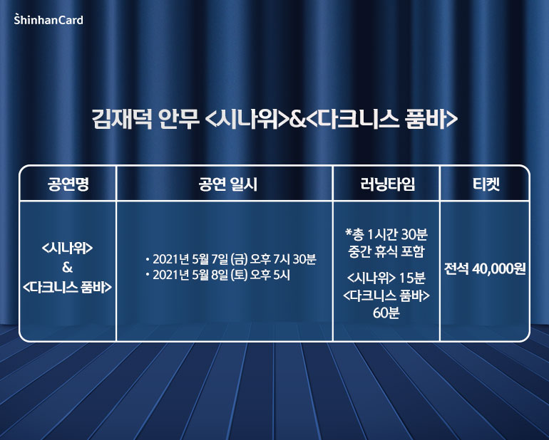 파격적인 소재와 도발적인 표현방식, 새로운 시도를 향한 끊임없는 도전으로 한국 현대무용계에서 독창적인 위치를 만들어온 김재덕이 그의 대표작 두 편 <시나위>와 <다크니스 품바>로 LG아트센터 무대에 오릅니다. 이번 작품은 연이어 펼쳐지는 형태로 진행되는데요.