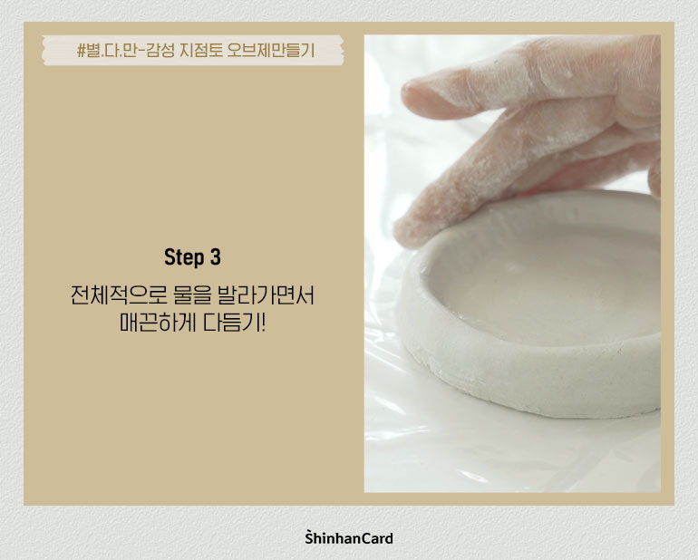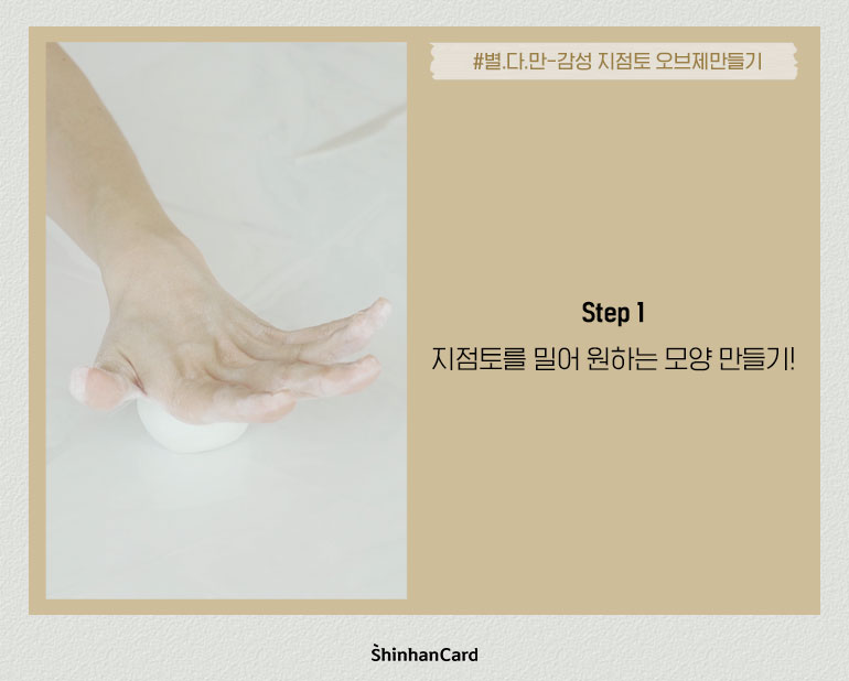 요즘 각종 SNS에서 화제인 지점토 오브제 만들기! 소품 트레이나 인센스 홀더 등 아기자기한 소품샵에서 봤던 바로 그 오브제! 작은 오브제에서 느껴지는 남다른 감성, 신한카드 ‘별.다.만’과 함께라면 손쉽게 재현해볼 수 있습니다. 단돈 500원으로 구매한 지점토만 있으면 똥손이어도 손쉽게 재현 가능하답니다. ‘별.다.만’만 믿고 따라오세요!