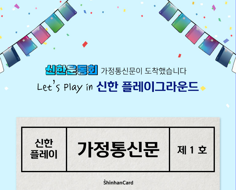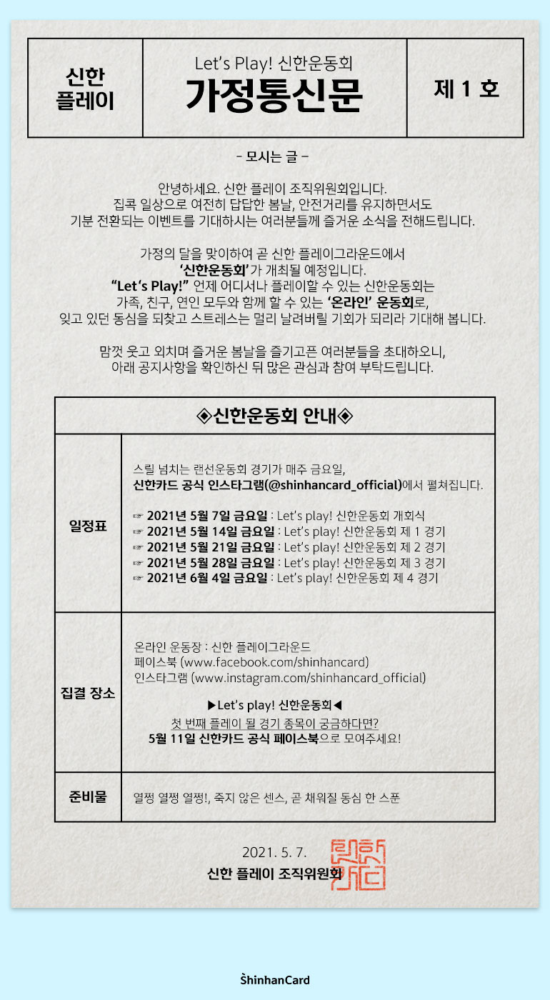 플레이 플레이 우리편, 이겨라! 이제는 추억이 되어버린 운동회가 그리운 분들을 위해 신한카드가 신나게 플레이할 수 있는 랜선운동회를 개최한다는 소식입니다. 짝짝짝! 신한운동회 개회식을 알리는 가정통신문을 여러분들에게 발송하오니 모두 참석하시어 자리를 빛내주시기 바랍니다.