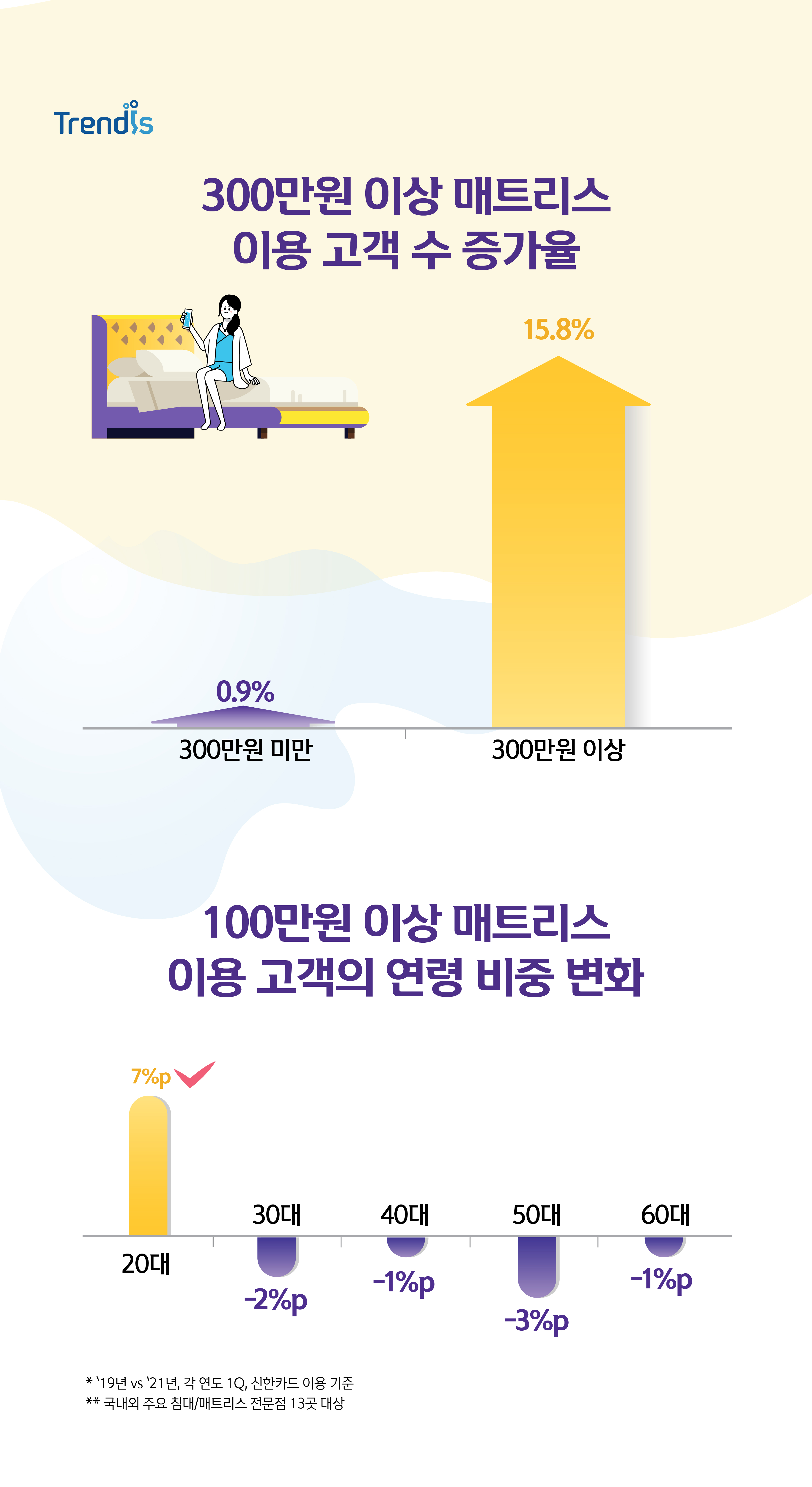 또한 요즘은 불안 및 스트레스로 인해 불면증을 겪는 사람들도 많아지고 있는데요. 이에 따라 숙면을 위한 고가의 매트리스, 침구 구매가 늘어나고 있습니다. 최근 2년간 300만원 이상의 매트리스를 구매한 고객은 약 16% 증가했는데 타 금액대에 비해 증가폭이 매우 높습니다. 뿐만 아니라, 100만원 이상의 매트리스를 구매한 고객의 연령층을 살펴보면 20대의 비중이 약 7%p 증가하며 가장 큰 비중 변화를 보였는데요. 숙면이 건강한 삶을 위한 필수 요소로 인식됨에 따라 질 좋은 수면을 위한 과감한 투자가 젊은 층으로까지 확대되는 모습이네요.