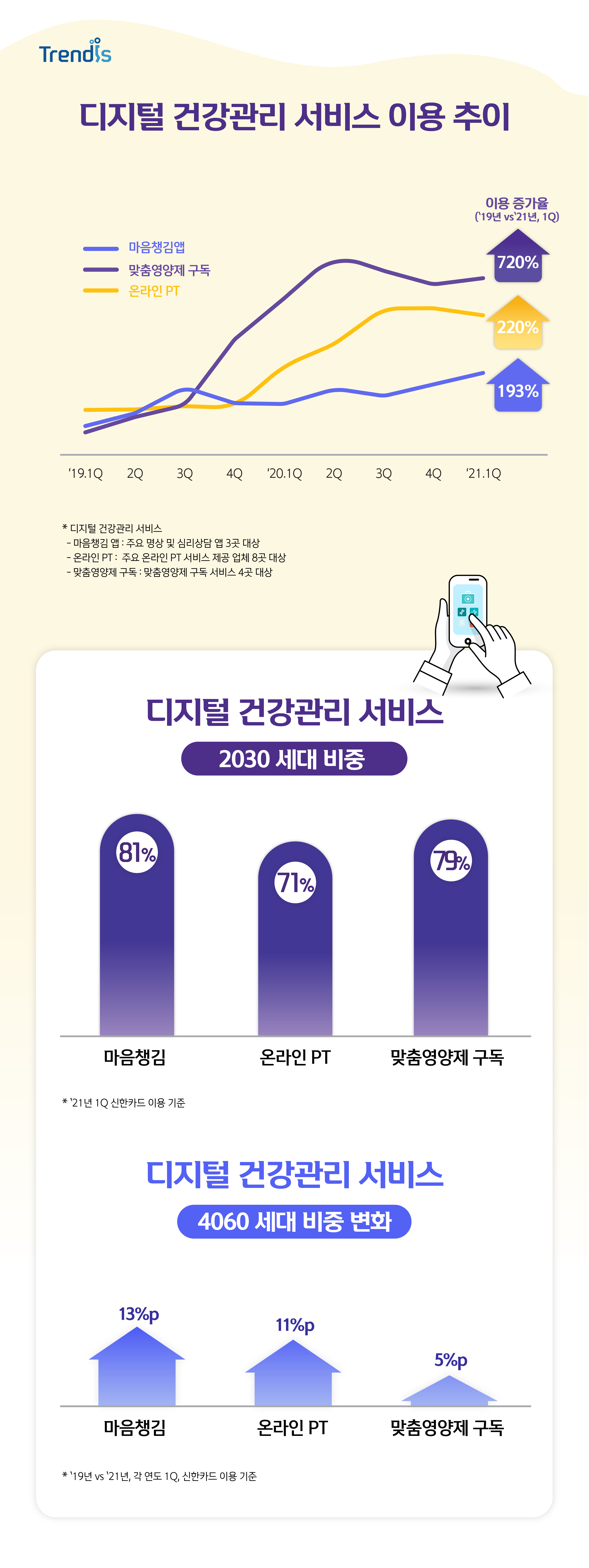 한편, 최근에는 전통적인 건강 관리법 이외에 스마트 기기, 어플 등 디지털 기술을 접목해, 쉽고 간편하게 몸과 마음을 케어할 수 있는 서비스들이 새롭게 등장하고 있는데요. 어플을 통해 명상이나 심리상담 서비스를 받을 수도 있고요. 개인별 맞춤 영양제를 정기배송해주거나, 비대면으로 운동 및 식단관리를 도와주는 퍼스널 트레이닝 서비스들이 특히 주목을 받고 있습니다