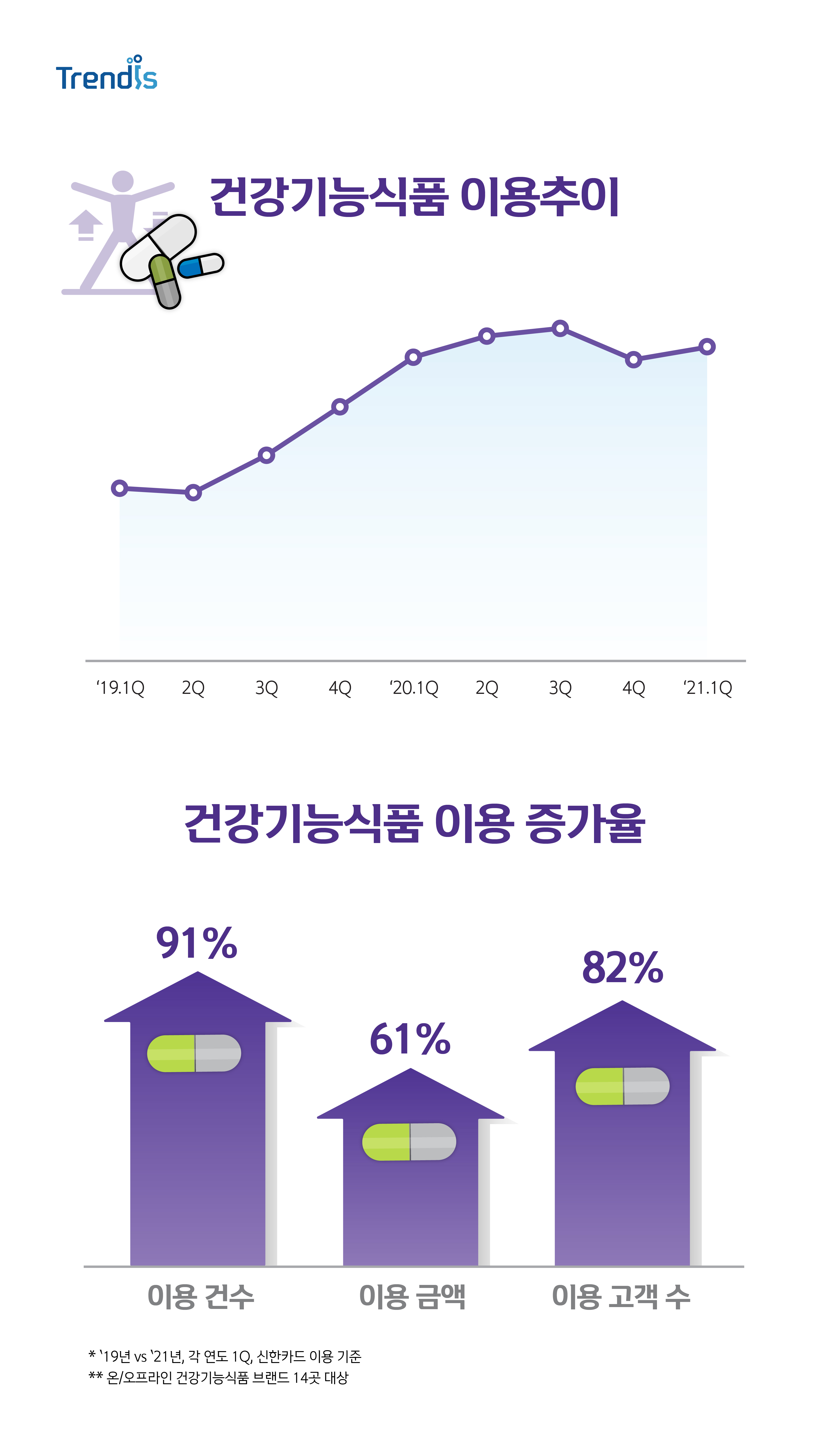 가장 주목해 볼 부분은 건강기능식품에 대한 이용이 눈에 띄게 증가한 것인데요. 최근 2년 사이 이용 건수는 약 90퍼센트 이상의 증가율을 보였습니다. 건강기능식품의 섭취는 건강을 지키기 위한 가장 대표적이고 전통적인 방법 중에 하나이고요. 요즘은 약국 이외에 제약사 직영몰, 오픈마켓 등을 통해 구매가 가능하며 해외제품의 구매를 대행해주는 플랫폼도 대중화되어 접근이 용이해졌습니다.