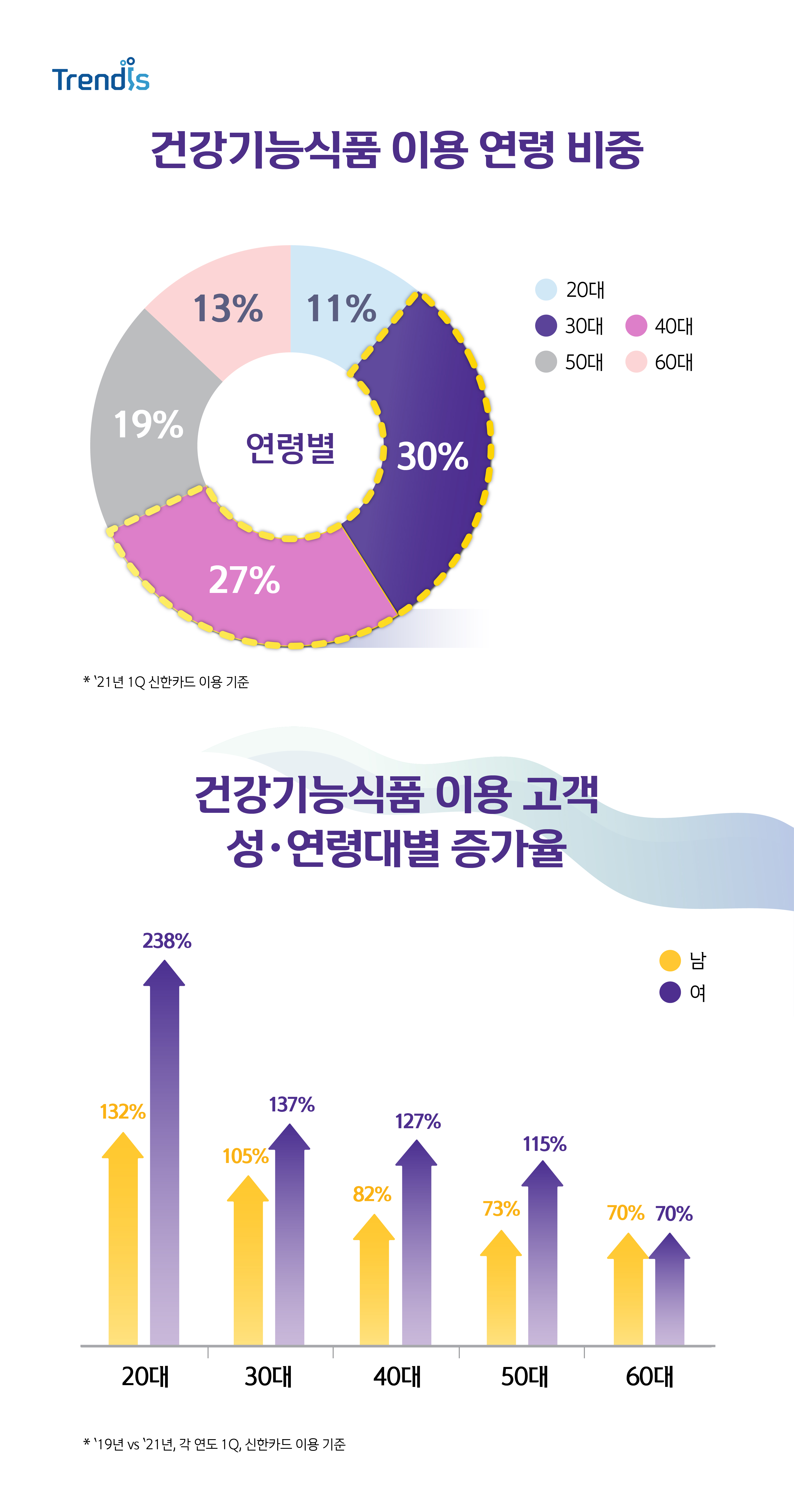 몸 관리도 자기개발의 하나로 생각할 만큼 건강관리에 적극적인 요즘 젊은층의 특성 때문일 수도 있고요. 건강기능식품의 상품군이 홍삼/녹용 등 전통 원료 중심에서 유산균/루테인/프로틴 등 면역강화 및 고단백 식품까지 다양화된 것도 주요 원인으로 꼽을 수 있습니다. 20대 중에서도 특히 여성의 이용 증가율은 200퍼센트가 넘어 가장 월등했는데요. 남성보다는 여성이 일상 속 건강관리에 관심이 많은 것 같네요.