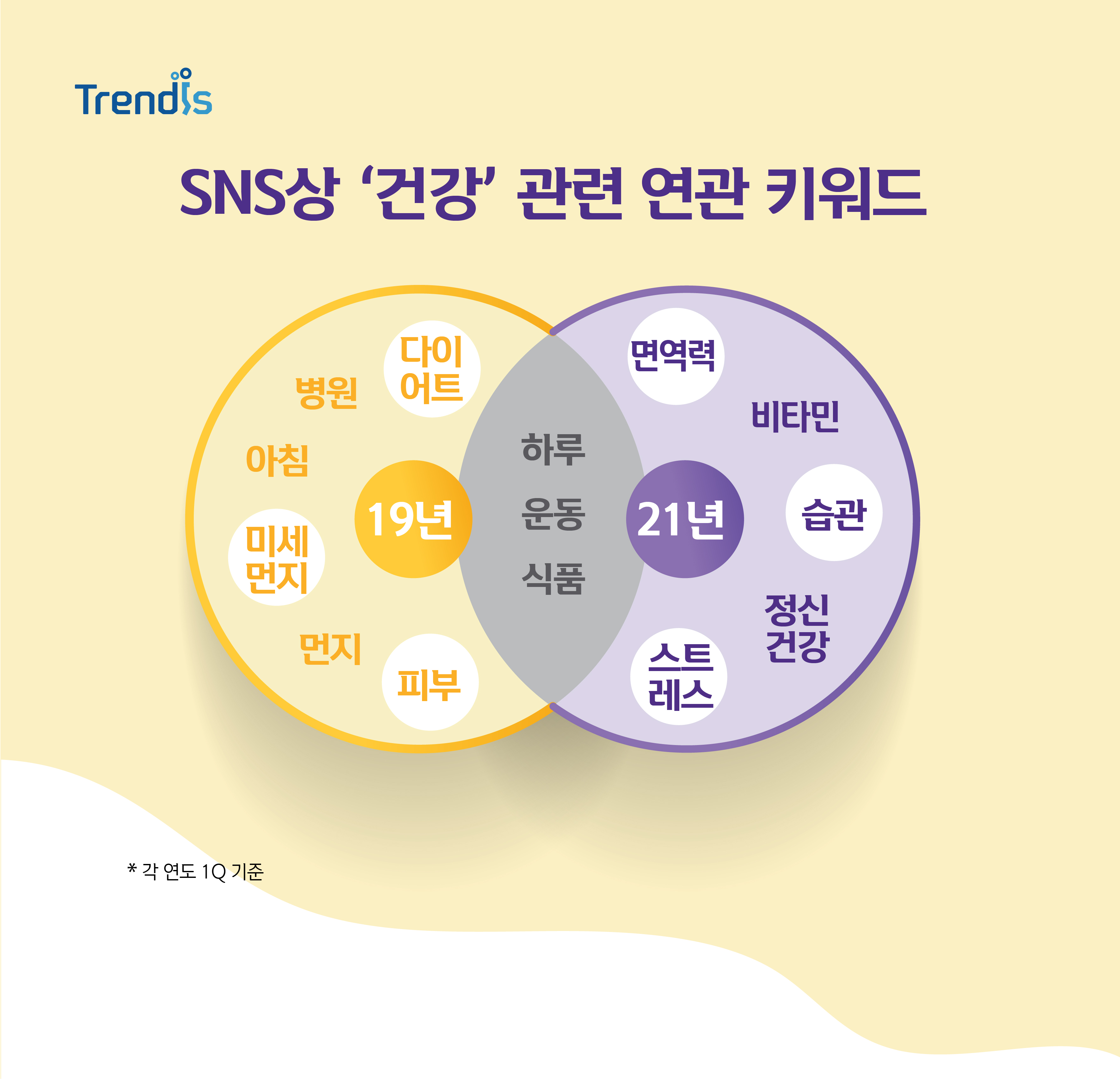 관련 키워드의 언급량도 늘어났고요. 연관 키워드를 통해 건강에 대한 인식이 이전과는 많이 달라졌음을 확인할 수 있는데요. 2019년에는 미세먼지/다이어트/피부 등 특정 시즌과 관련 있거나 미용 측면에서의 언급이 많았다면, 최근에는 스트레스/면역력/습관 등 심리적 안정과 더불어 일상 속 예방과 케어에 관한 연관어가 많이 등장했습니다. 건강관리가 보다 일상화됨에 따라 좋은 습관을 통해 미리 몸과 마음을 챙기려는 움직임이 많아지고 있는 것 같네요.