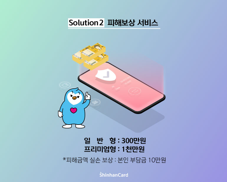 만약 피싱 피해를 입게 된다면 어떡하나요? 피싱안심 서비스는 금융사기 발생 시 보상한도 내에서 실제 손해비용을 보상하는 든든한 서비스를 제공하고 있으니 안심하세요. 일반형 가입자는 300만원, 프리미엄형 가입 시 최대 1천만원을 보상하고 있어요. 가입일 기준, 익일 0시부터 즉각적인 효력이 발생하는 확실한 솔루션이 여러분의 금융 라이프를 지켜드립니다.