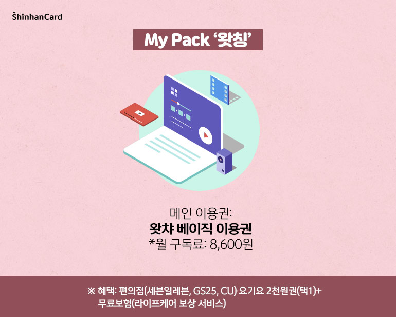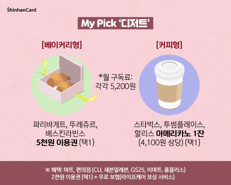 신한카드 My Pick & Pack 서비스는 크게 [디저트], [뷰티], [왓칭], [오디오북(오픈 예정)]으로 나눠진 네 개의 카테고리 중 내가 원하는 콘텐츠를 선택, 각각의 서비스에 포함된 브랜드를 매월 자유롭게 선택해서 이용하시면 됩니다. 실제 가격보다 저렴한 이용권에 더해 매월 추가 혜택으로 제공되는 ‘2천 원 이용권’과 ‘무료 보험’도 야무지게 챙겨가세요!
