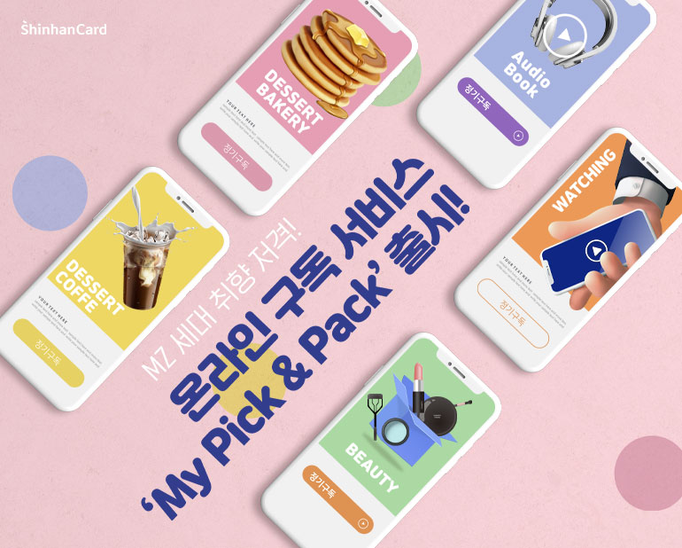 나만의 라이프 스타일을 완성시키기 위한 지름길, 온라인 구독 서비스가 더욱 더 다양화되고 있는데요. 클릭 한 번으로 간편하게 취향을 구독하면서 일상을 스마트하게 이끄는 MZ 세대들을 위해 신한카드 ‘My Pick & Pack’ 서비스를 출시했습니다. 취향 따라 고르면 혜택으로 야무지게 묶이는 기특한 서비스! 디저트, 뷰티, 왓칭, 오디오북까지 여러분의 메인 테마는 무엇인가요? 함께 Pick 해볼까요?