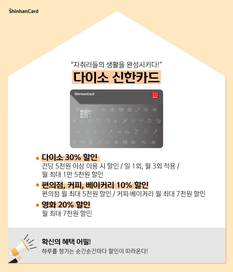 생활필수품부터 일상을 윤택하게 해주는 기특한 아이템까지 모두 모여 있는 다이소! 남녀를 불문하고 모두의 취향을 저격하며 1인 가구의 백화점 노릇을 톡톡히 해주는 곳이죠. 합리적인 가격으로 살림비용을 줄여주고 삶의 질은 높여주는 다이소와 제휴한 신한카드를 만나보세요. 스타벅스와 커피빈 카페와 파리바게트, 뚜레주르는 물론이고 GS25, CU 편의점 및 CGV, 롯데시네마 영화 할인까지 우리네 생활권을 든든하게 책임지는 카드랍니다.