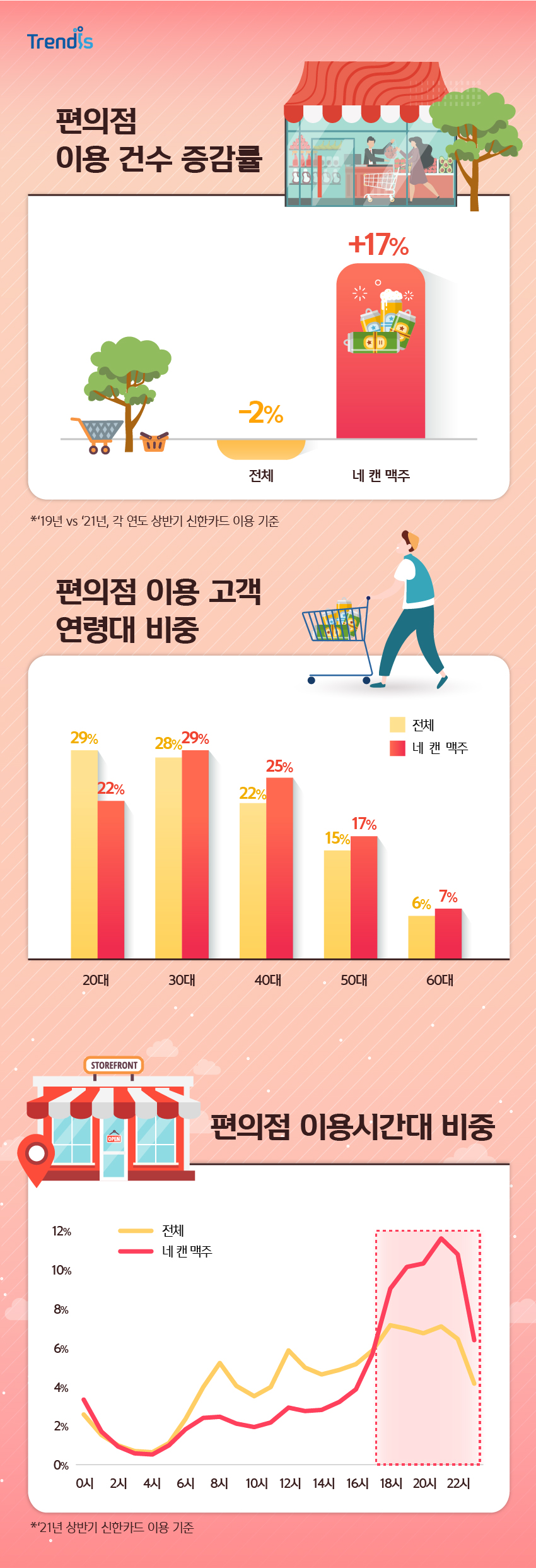 이러한 인기를 보여주듯, 편의점 전체 이용 건수는 ’19년 상반기 대비 소폭 감소했음에도 불구하고 네 캔 맥주 구매는 17% 증가한 것으로 나타났는데요.
