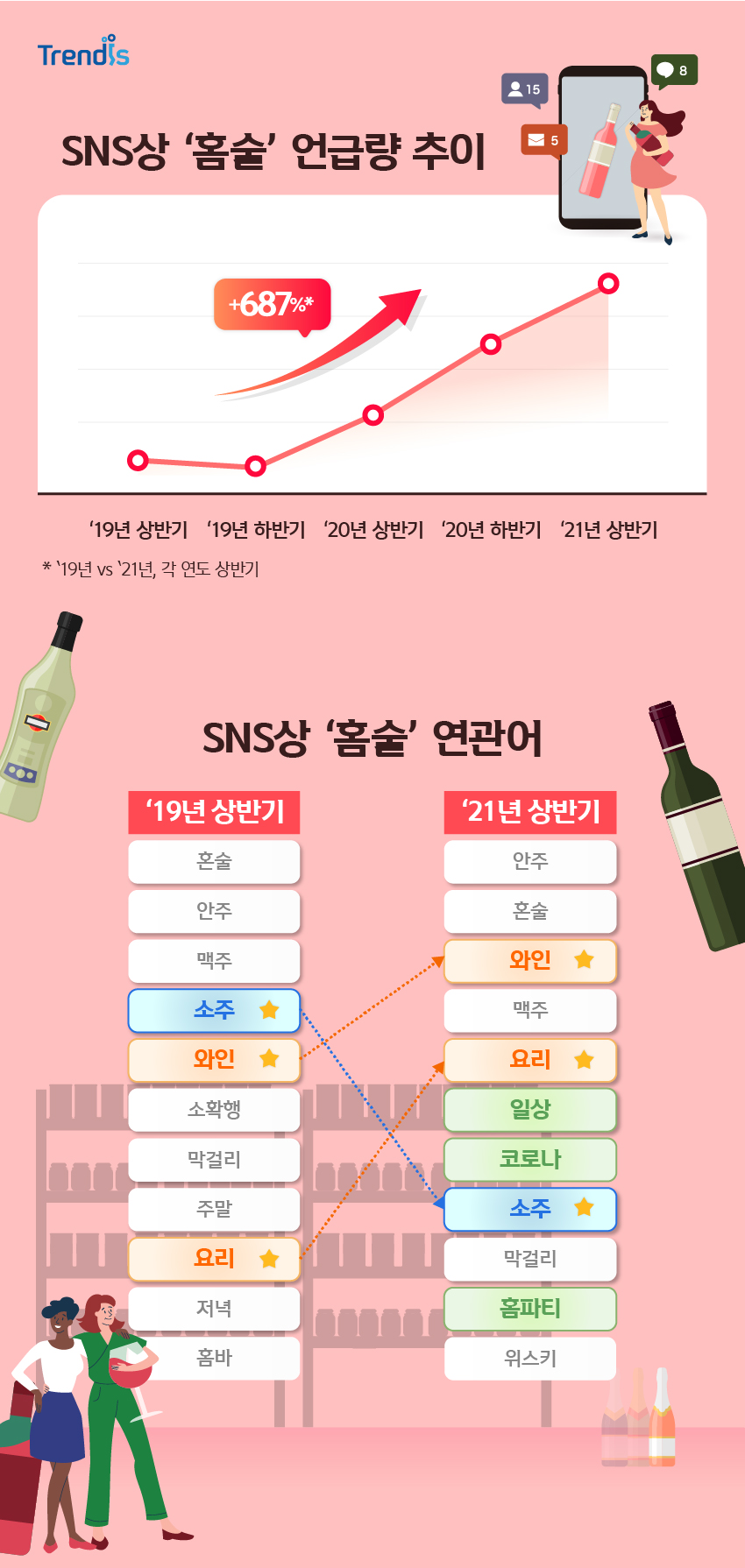 SNS 상에서 ‘홈술’을 언급한 추이를 살펴보면 코로나19가 확산되기 시작한 ‘20년 상반기부터 언급량이 가파르게 상승하여 687%나 증가했는데요.
