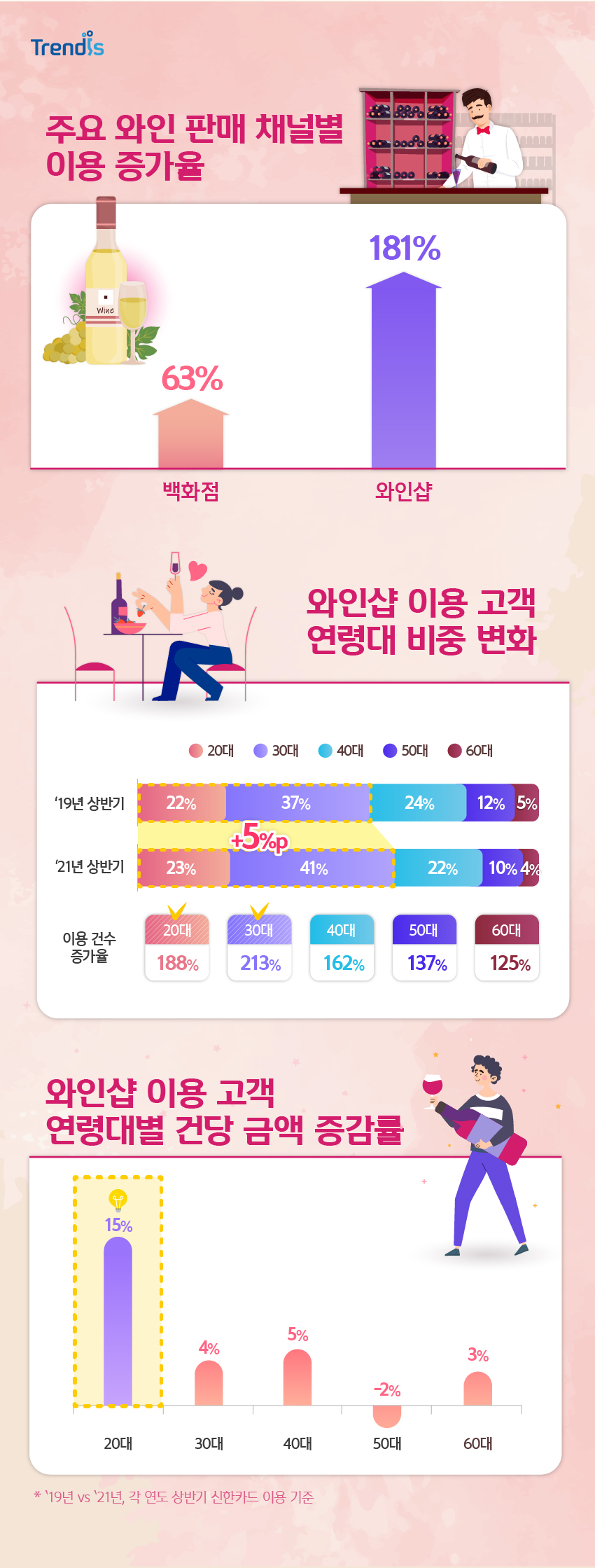 특히 젊은 고객들을 중심으로 와인 판매가 크게 늘었습니다. 20~30대의 와인샵 이용 건수는 각각 188%, 213% 증가하여, 이들 세대의 이용 비중은 약 5%p 증가하였고요. 특히 20대는 이용 건수 증가뿐 아니라 건당 이용 금액도 가장 많이 증가한 세대로 나타나, 와인에 대한 높은 관심도를 보여주고 있습니다.