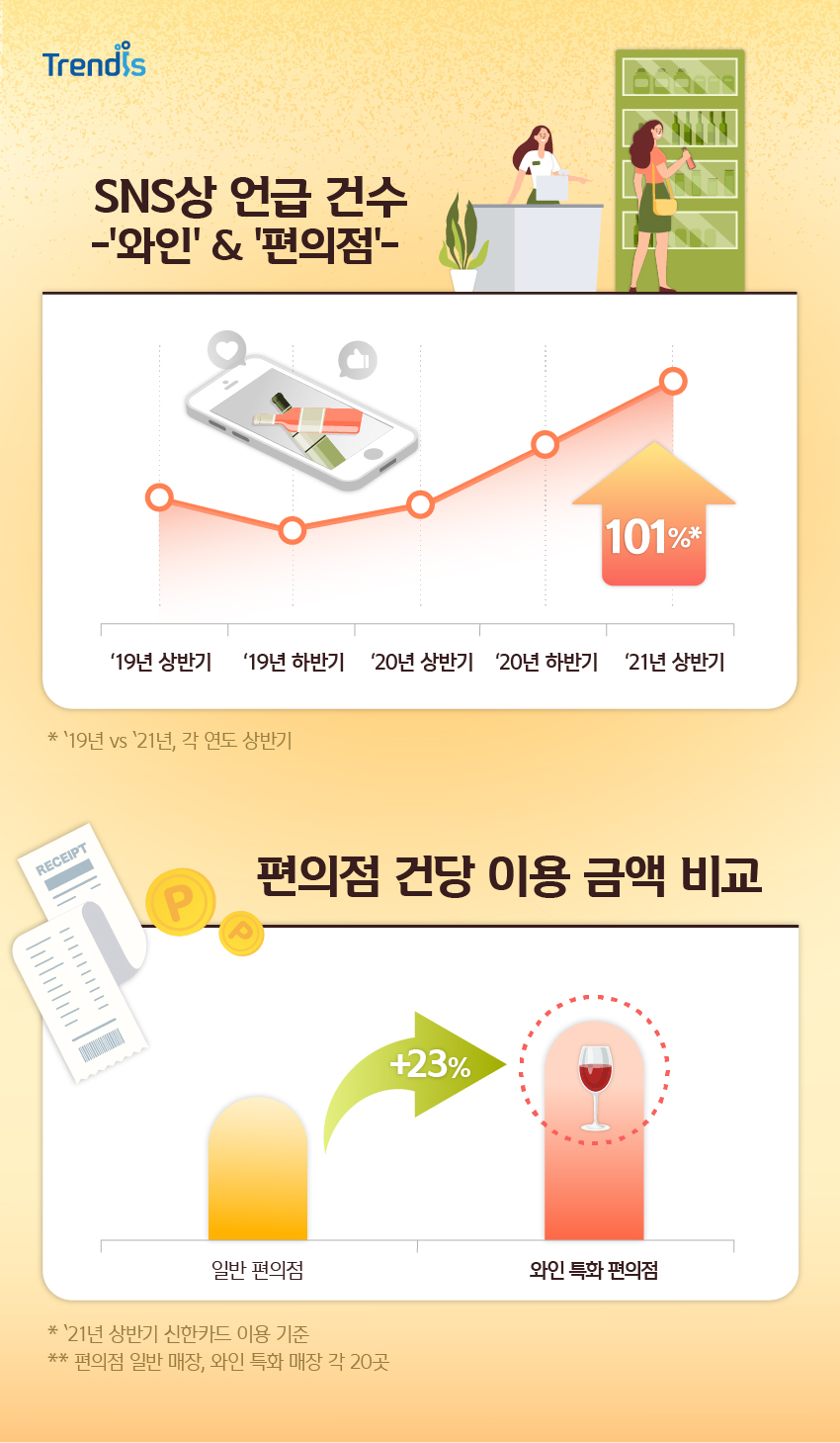 실제로 SNS 상에서는 ‘와인’과 편의점’을 함께 언급한 건수가 크게 증가했습니다. 또한 편의점 중 다양한 와인을 판매하는 주류 특화 매장과 일반 매장의 건당 이용금액을 비교해보니 주류 특화 매장의 건당 이용금액이 일반 매장보다 더 높게 나타났습니다.