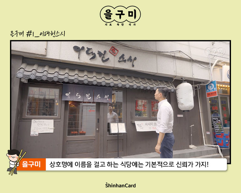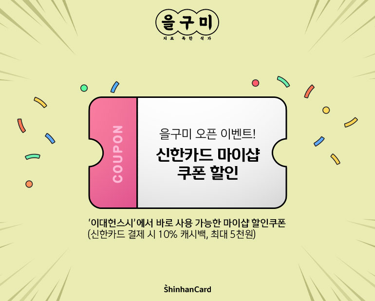 앞으로 을구미가 방문할 식당들에서는 식사를 마치면 즐거운 단계가 기다리고 있을 거예요. 바로 ‘신한카드 마이샵(MySHOP)’ 링크를 통해 받은 마이샵 쿠폰을 제시하면 야무진 할인이 들어가기 때문이죠! 신한카드의 소상공인 사장님들을 위한 서비스, 마이샵 파트너들은 앞으로도 꾸준히 소개될 예정입니다. 여러분들은 마이샵 파트너 가맹점들을 방문해서 즐거운 할인을 누리세요!