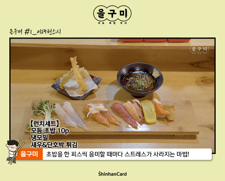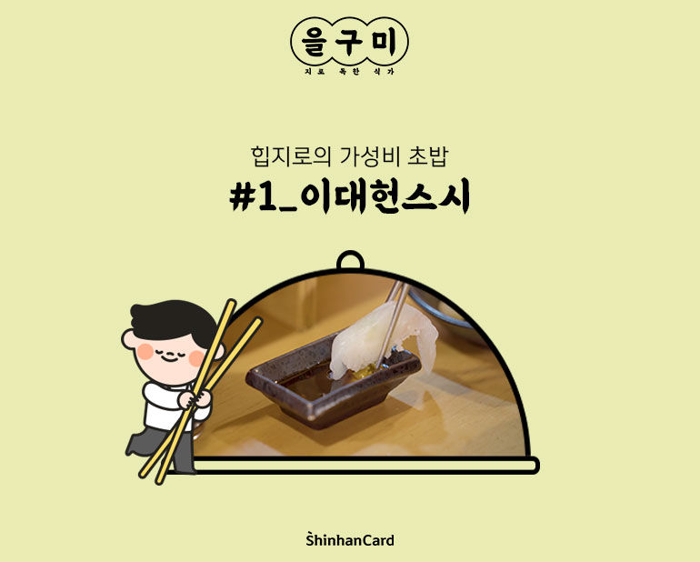 을구미와 함께 한 첫 번째 배부른 산책, 어떠셨나요? 오늘 만나 보신 음식점 ‘이대헌스시’에서 바로 사용 가능한 마이샵 할인쿠폰(신한카드 결제시 10% 캐시백, 최대 5천원)을 공유합니다. 을지로 맛집 탐방 전에 반드시 챙겨가야 할 마이샵 할인 쿠폰! 신한 페이판에서 이용하실 수 있습니다.