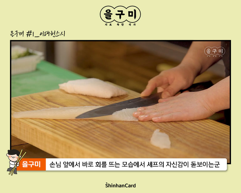 을구미: 흠, 화려하지 않아도 아담한 일본식 인테리어가 물씬 풍기는 내부. 음식에만 집중하기 좋은 분위기이군. 이대헌스시는 초밥 외에도 사시미, 지라시스시, 덮밥류가 상시 풍성하게 준비되어 있는 메뉴구성! 오픈 주방까진 아니라도 손님 앞에서 바로 회를 뜨는 모습에서 셰프의 자신감이 돋보이는군.