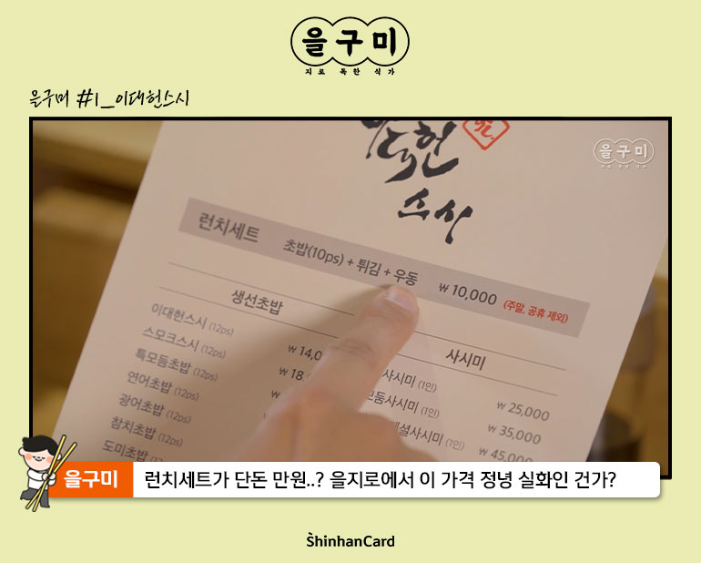 을구미와 함께 한 첫 번째 배부른 산책, 어떠셨나요? 오늘 만나 보신 음식점 ‘이대헌스시’에서 바로 사용 가능한 마이샵 할인쿠폰(신한카드 결제시 10% 캐시백, 최대 5천원)을 공유합니다. 을지로 맛집 탐방 전에 반드시 챙겨가야 할 마이샵 할인 쿠폰! 신한 페이판에서 이용하실 수 있습니다.