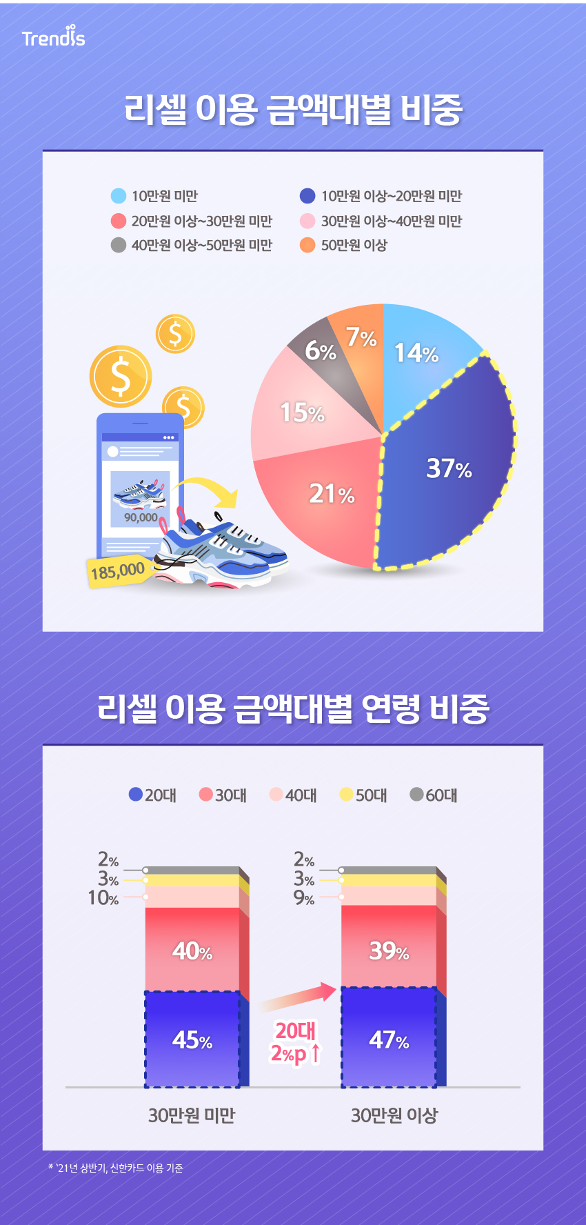그렇다면 리셀 상품은 주로 얼마에 거래가 이뤄지고 있을까요. 리셀의 이용 금액대를 살펴보면 10~20만원 대의 구매가 37%로 가장 큰 비중을 차지하고요. 30만원 이상의 고가의 거래 비중도 28%나 되는 것으로 나타났습니다.