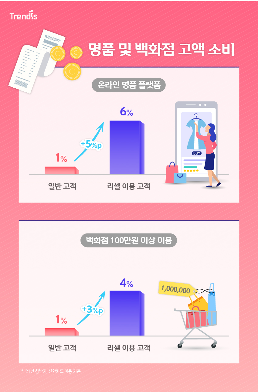 또한 이들은 럭셔리 제품에 대한 소비도 많은 편이었는데요. 최근 떠오르고 있는 온라인 명품 플랫폼의 이용도 일반 고객보다 높고요. 주요 백화점 내에서의 고액 결제자 비중도 좀 더 많은 것으로 나타났습니다. 아무래도 명품 및 하이엔드(High-End) 브랜드에는 리셀 플랫폼에서 선호되는 소량 생산의 유니크한 제품이 많기 때문일 수도 있고요. 쉽게 구하기 힘든 럭셔리 제품들은 시간이 지남에 따라 희소가치로 인해 가격이 상승하므로 재테크의 목적을 가지고 적극적으로 구매에 임할 수도 있을 것 같습니다.