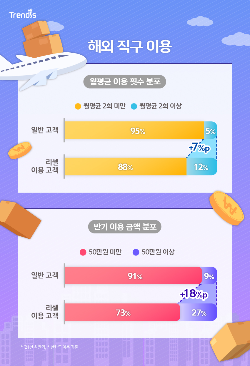 월평균 2회 이상 해외직구를 이용하는 비중이 일반 고객 대비 7%p 많았고요. 올해 상반기에 해외직구를 통한 지출이 50만원 이상인 고객의 비중도 18%p나 더 높았습니다. 리셀 이용 고객은 상대적으로 해외 브랜드에 대한 지식과 정보가 많은 편인 것 같고요. 직구가 상대적으로 배송 기간이 길고 구매의 수고스러움이 큰 것으로 보아 소유하고자 하는 브랜드와 제품에 대한 주관이 뚜렷하고 취향이 확고한 소비자임을 짐작해볼 수 있습니다.