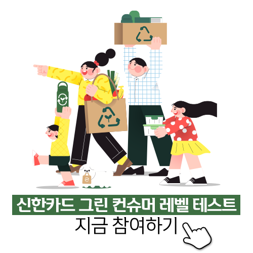필(必)환경 시대를 살아가고 있는 여러분에게 가치 있는 소비란 무엇인가요? 각자의 기준이 있겠지만 아마 나에게 의미 있는 제품이나 나의 가치관에 부합하는 제품을 소비하였을 때 가치 있는 소비라고 생각하겠죠? 환경에 대한 관심이 그 어느 때보다 뜨거운 요즘, 더 많은 고객분들이 그린 컨슈머(Green Consumer)가 되기를 바라는 마음으로 신한카드에서 그린 컨슈머 레벨 테스트를 준비했습니다!