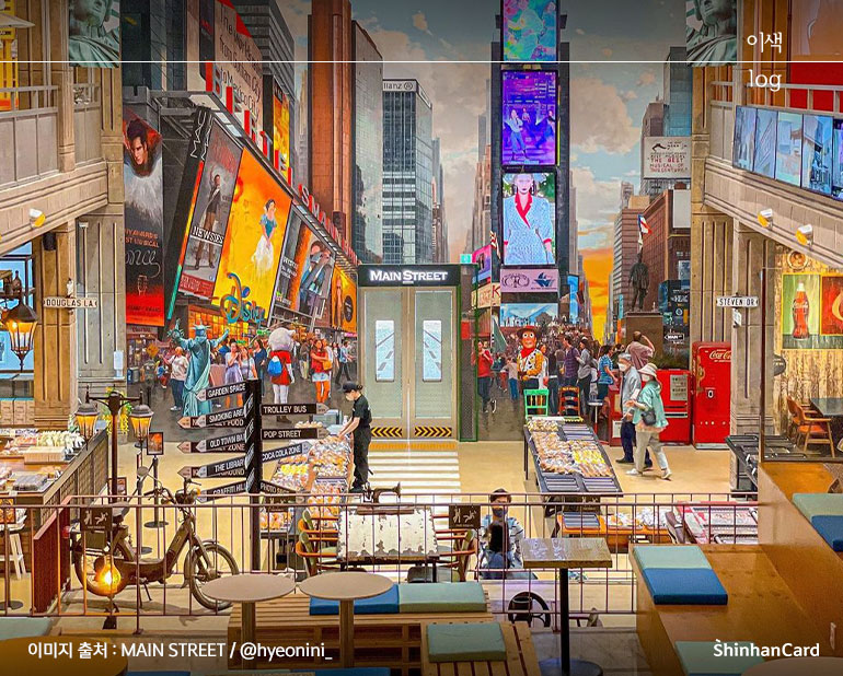 1,500평이라는 초대형 규모를 자랑하는 MAIN STREET은 남다른 화려함과 웅장함을 자랑합니다. 3층짜리 외관을 덮고 있는 벽돌은 300년이 넘는 것으로 외국에서 특별히 공수해 왔다고 하는데요. 이렇게까지 진심으로 뉴욕을 재현한 스케일답게 넉넉한 주차 공간도 확보하고 있고요. 메인 입구로 향하는 길목은 첼시의 가로등을 연상케 하는 조명으로 꾸며져, 들어가기 전부터 뉴요커가 된 기분을 느끼게 될 거예요.