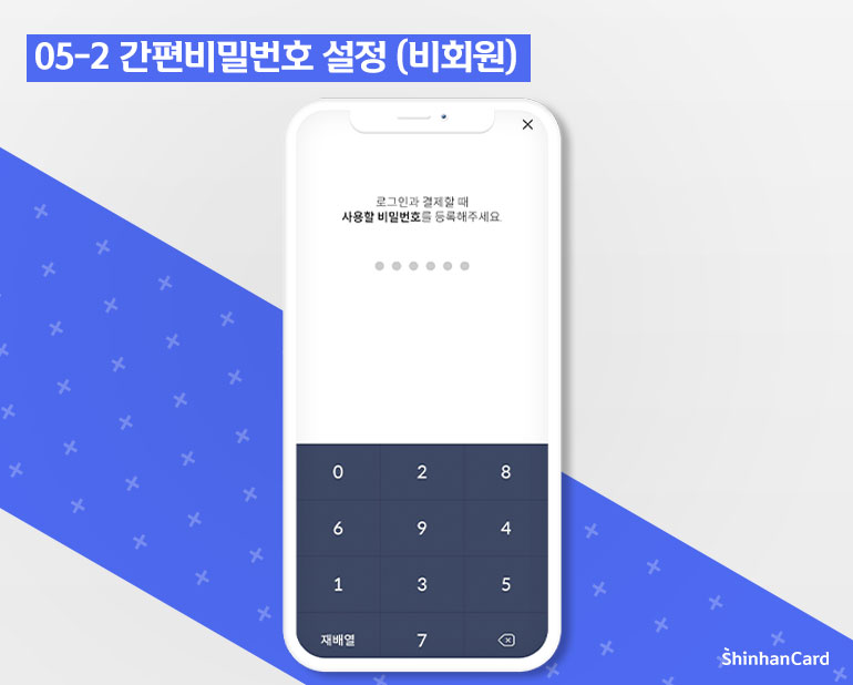 신한카드가 없는 회원들은 카드 비밀번호 입력 단계 없이 간편비밀번호 6자리를 설정하면 신한페이머니(선불 충전 결제용 카드) 회원으로 가입할 수 있습니다.