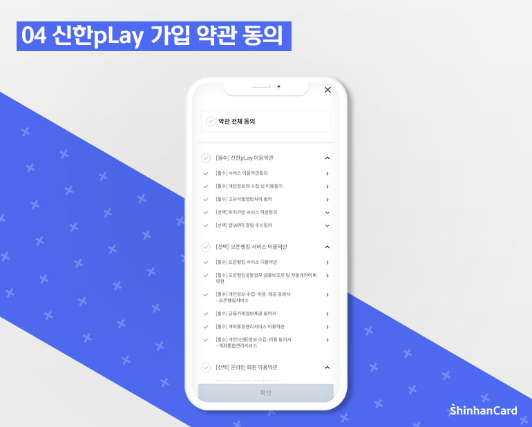 휴대폰 본인인증까지 끝냈다면 이제 신한 pLay 가입을 위한 약관 동의가 남았는데요. 가입 약관에는 서비스 이용을 위한 [필수] 약관과 부수 서비스 이용을 위한 [선택] 약관이 따로 표시가 되어 있으니 원하는 약관에 체크 후 확인 버튼을 눌러주세요.