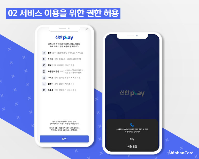 신한 pLay 앱 설치까지 끝냈다면 이제 회원가입이 남았습니다. 따라만 하면 누구나 쉽고 빠르게 가능한 회원가입! 눈 크게 뜨고 집중해주세요. 신한 pLay 앱을 처음 실행하면 허용 권한 단계가 나옵니다. 안전하고 편리한 서비스 이용을 위해 여러 권한 요청이 필요하지만 우선 필수 권한인 전화 권한을 허용해주세요. 다음 단계인 사용정보접근권한 설정 화면에서는 설정으로 이동하거나 다음에 하기를 선택해주세요. 이제 본격적인 가입 진행을 위한 준비는 끝입니다.