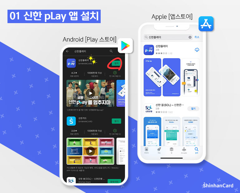 먼저, 신한 pLay 앱 다운로드(설치)를 위해 삼성, 엘지폰 등 안드로이드 사용자는 ‘Play 스토어’, 애플 아이폰 사용자들은 ‘앱스토어’를 실행해 신한플레이를 검색해주세요. 검색 후 [설치] 버튼을 누르면 자동으로 신한 pLay 앱 설치가 진행됩니다. 설치가 완료되면 바로 [열기] 버튼을 눌러 신한 pLay 앱을 실행할 수 있고, 모바일 화면 내 신한 pLay 앱 아이콘으로도 바로 확인하실 수 있답니다.