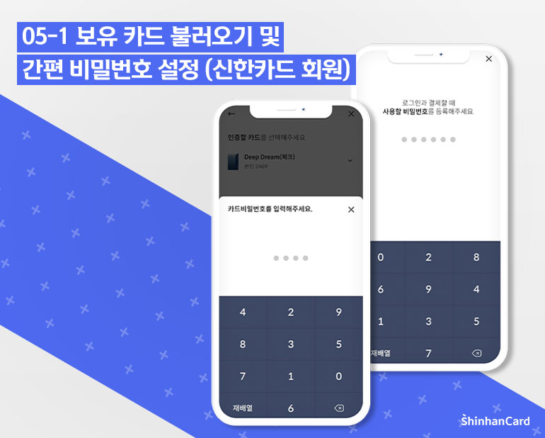 이제 마지막 단계! 신한카드(신용/체크)가 있는 회원이라면 자동으로 카드가 업데이트되는데요. 카드 비밀번호 4자리를 입력하면 별도 등록 절차 없이 모든 카드가 신한 pLay 월렛에 담기고 이 카드들로 신한 pLay결제가 가능해집니다. 앞으로 사용하게 될 간편비밀번호 6자리까지 설정하면 신한 pLay 가입 완료!