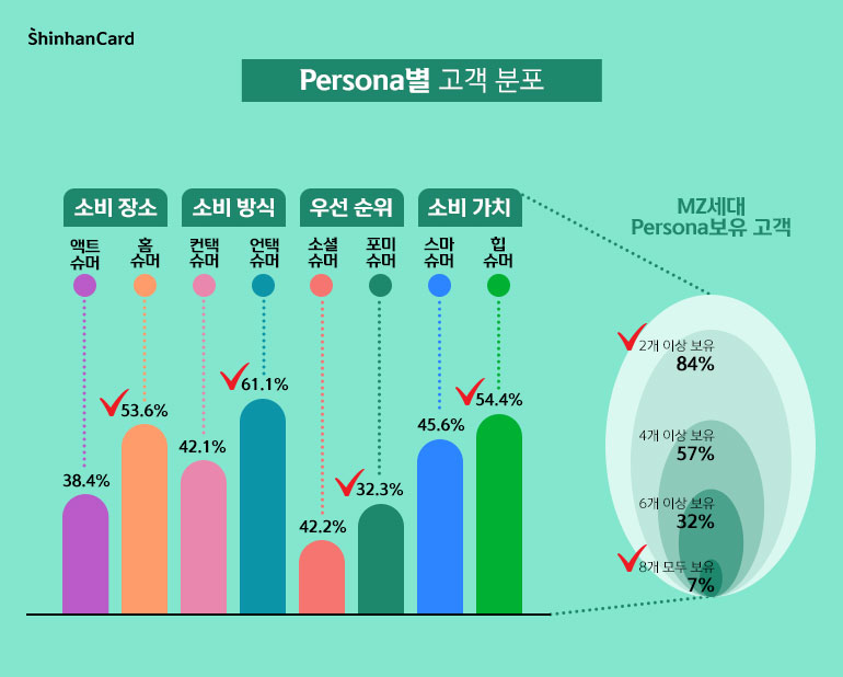 앞에서 정의한 8개의 페르소나를 활용해 신한카드 업종/결제 등 이용 고객 빅데이터를 분석해보면 MZ고객의 멀티 페르소나 성향을 그대로 보여주듯 2개 이상 페르소나를 보유한 고객이 전체 84%나 되었으며, 8개 페르소나 모두를 보유한 고객이 7%로 나타났습니다. 특히 8개 페르소나 중에서도 홈슈머, 언택슈머, 힙슈머 등 MZ의 대표 성향이라고 할 수 있는 특성들이 데이터로 잘 나타났습니다. 신한카드는 이러한 페르소나 각각의 점수를 고객별로 산출할 수 있도록 개발하여 추후 고객이 자신의 8개 페르소나 점수를 알 수 있도록 했습니다.