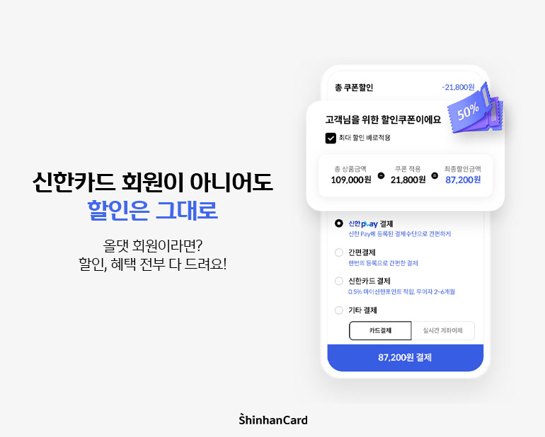 모바일 결제 강자 신한카드답게 결제도 세상 간편하답니다! 똑똑하게 적용되는 할인 혜택과 쿠폰 덕분에 번거로운 시간을 줄여줘요. 처음부터 마지막까지, 기분 좋은 쇼핑을 가능케 하는 스무스한 루트를 즐겨보세요.
