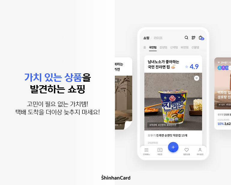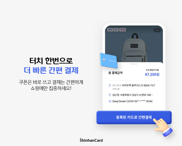 모바일 결제 강자 신한카드답게 결제도 세상 간편하답니다! 똑똑하게 적용되는 할인 혜택과 쿠폰 덕분에 번거로운 시간을 줄여줘요. 처음부터 마지막까지, 기분 좋은 쇼핑을 가능케 하는 스무스한 루트를 즐겨보세요.