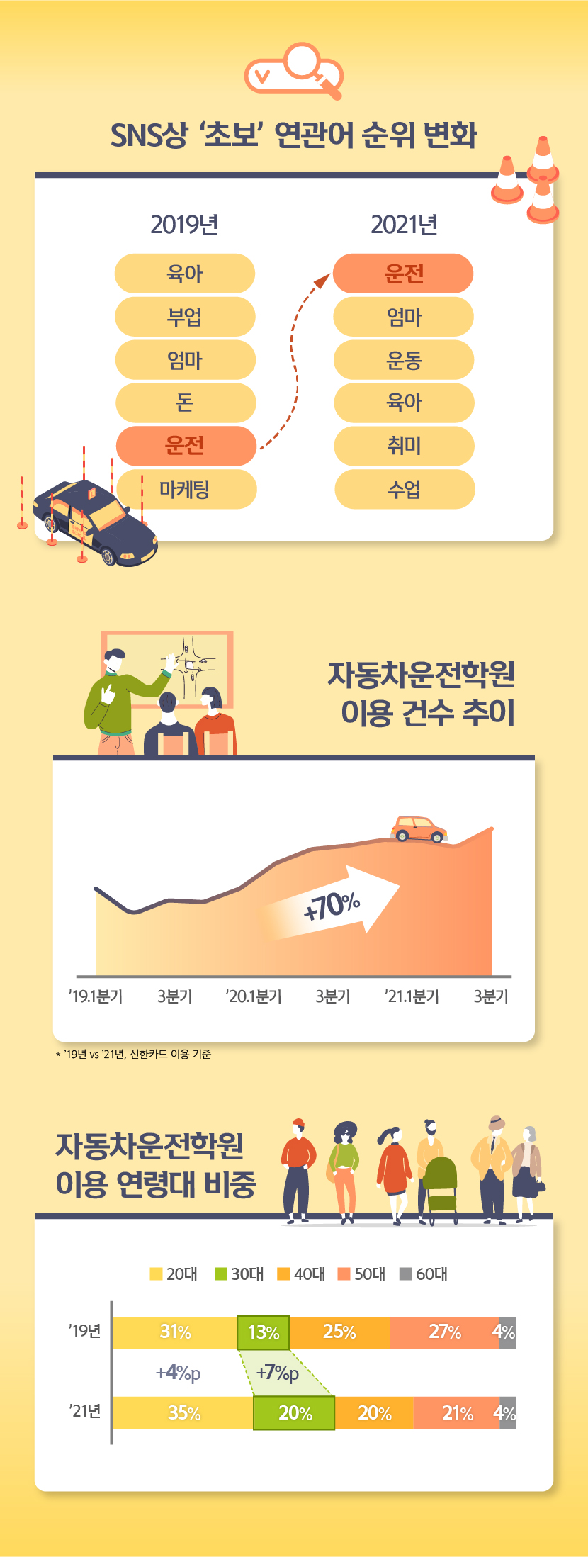 운전학원 이용 건수 또한 '19년 대비 70% 증가하였으며, 사회활동이 활발한 30대의 이용 증가가 특히 두드러집니다.