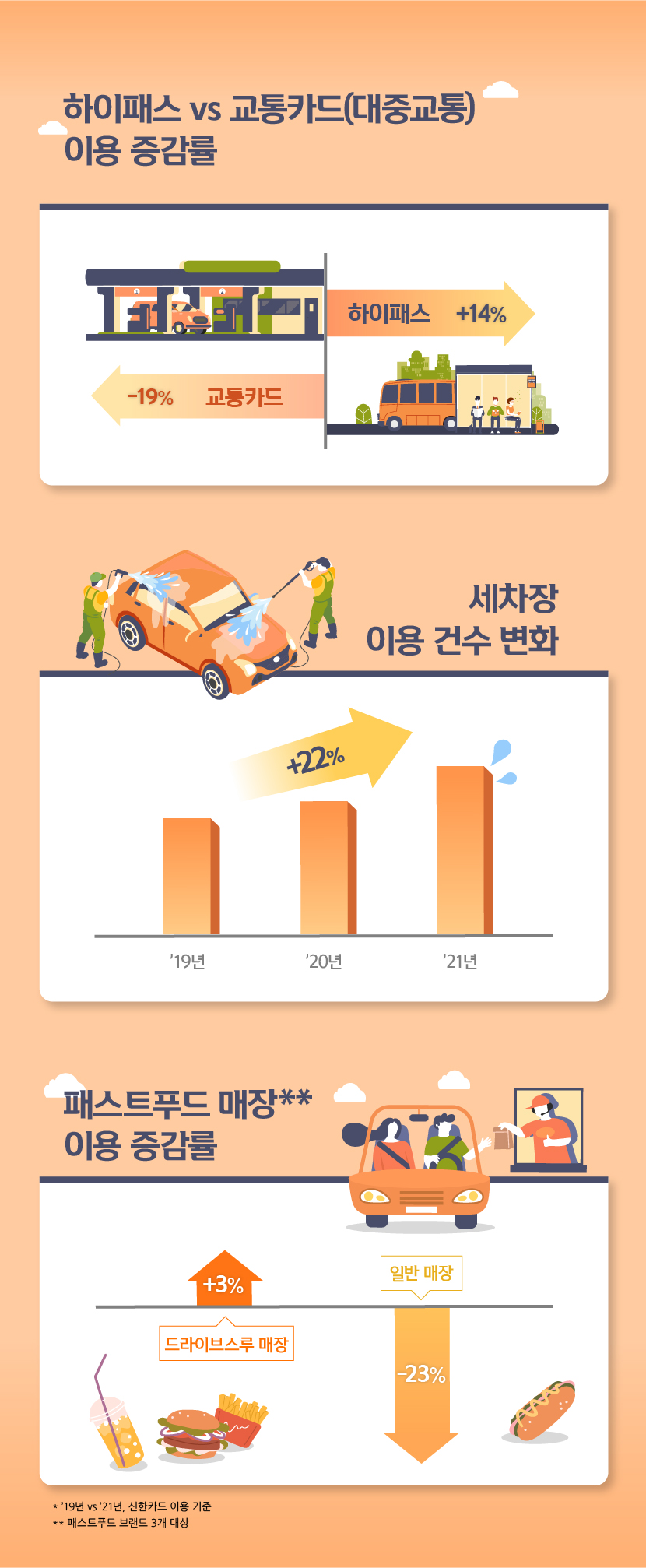 세차와 같은 자동차 관련 서비스 이용 또한 증가하였고요. 차에 탄 채로 음식을 주문해 받을 수 있는 드라이브스루 매장의 인기도 높아졌습니다. 패스트푸드점의 드라이브스루 매장 이용은 '19년 대비 3% 증가했는데요, 일반 매장 이용이 크게 감소한 것과 대조되는 모습입니다.