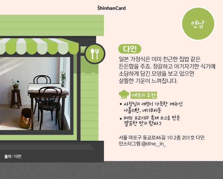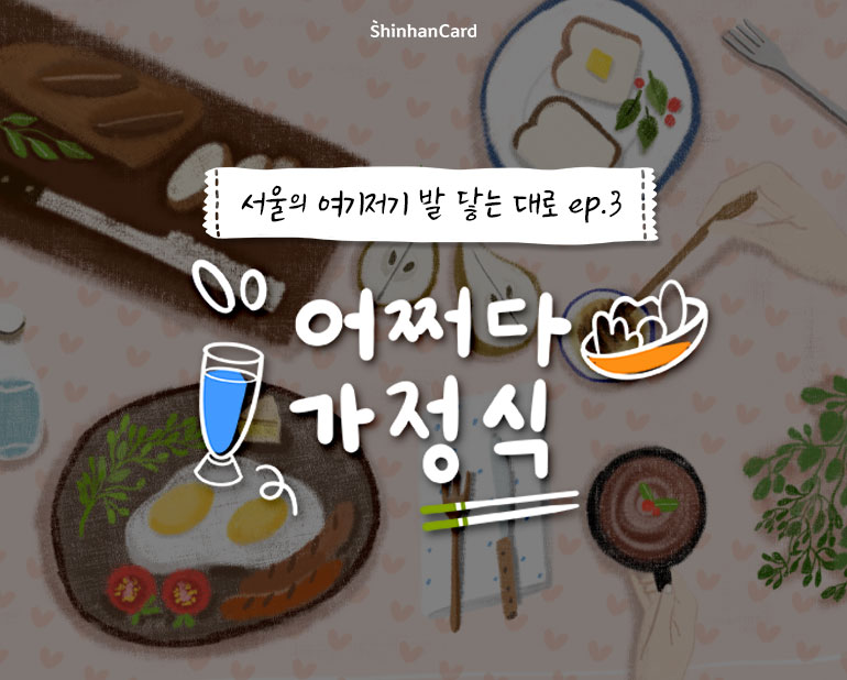 몸도 마음도 쉽게 지치는 날들에서 정성과 온기가 느껴지는 한 상을 받기란 쉽지 않죠. 맛있는 위로가 필요한 분들을 위해 오늘은 신한카드가 ‘가정식’을 준비했습니다. 따로 또 같이, 가정식을 먹고 싶은 분위기와 사람을 상상하며 가정식 핫스팟들을 만나보세요!
