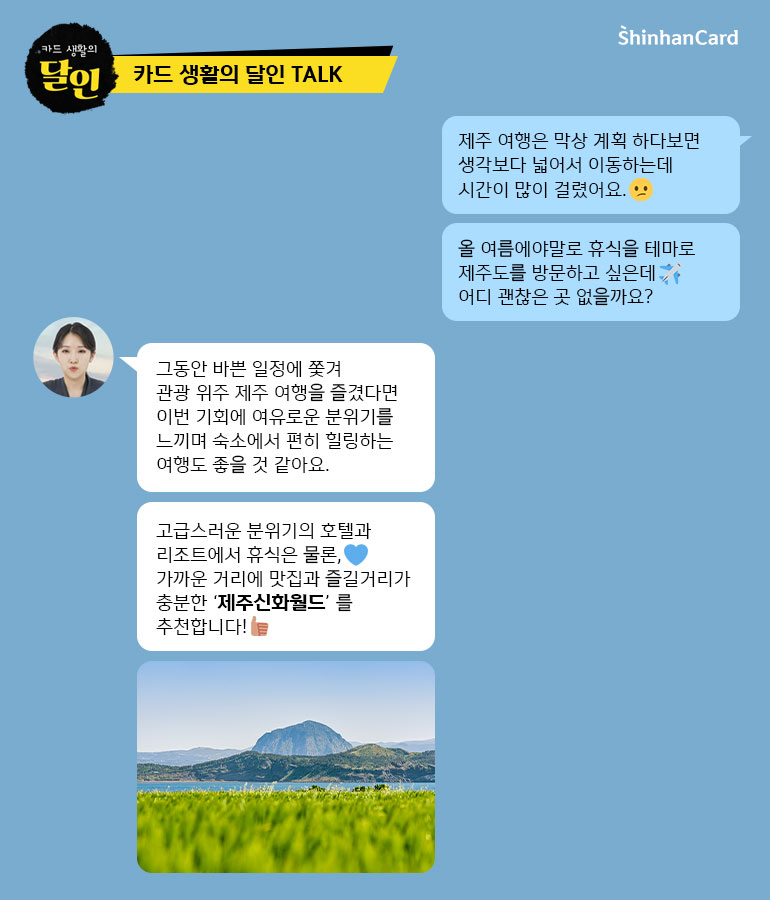 자연경관뿐만 아니라 퀄리티를 보장하는 맛집부터 테마파크까지 한 번에 누릴 수 있는 이곳, 프로 제주여행객들이라면 한 번쯤 여행루트에 넣어봤을 법한 곳인데요. 올 여름, 우리가 ‘제주신화월드 신한카드’와 함께 떠나야 하는 이유! 지금부터 신한카드 하나로 달인이 된 카드 생활의 달인이 추천하는 카드 이야기! 진정 제주 여행의 달인이 되기 위해서 이 카드를 꼭 챙겨볼까요?