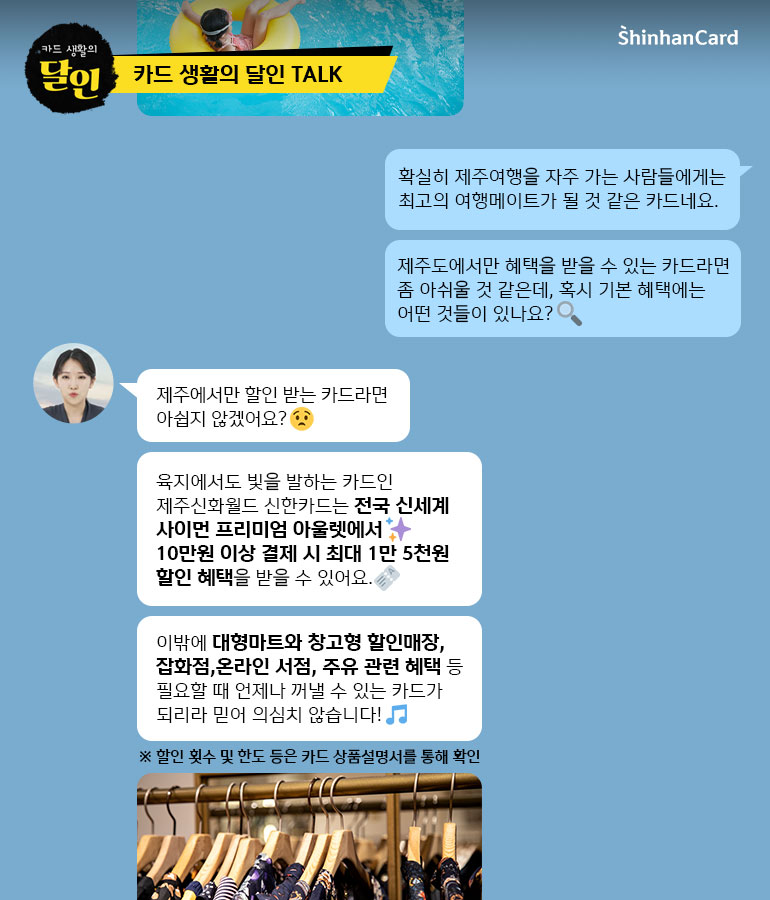 보통의 일상에선 야무진 혜택을 누리다가 제주에서 손쉬운 힐링으로 보상받게 하는 제주신화월드 신한카드! 반복되는 매일을 돌보는 나날과 매번 새로운 감각을 일깨워주는 여행의 순간에도 늘 함께 하겠습니다. 여행객 모두를 기분 좋게 만드는 ‘재주’를 가진 제주도에서 가장 멋진 진가를 발휘하는 제주신화월드 신한카드와 함께 진정한 제주 여행의 달인이 되보기로 해요 우리!