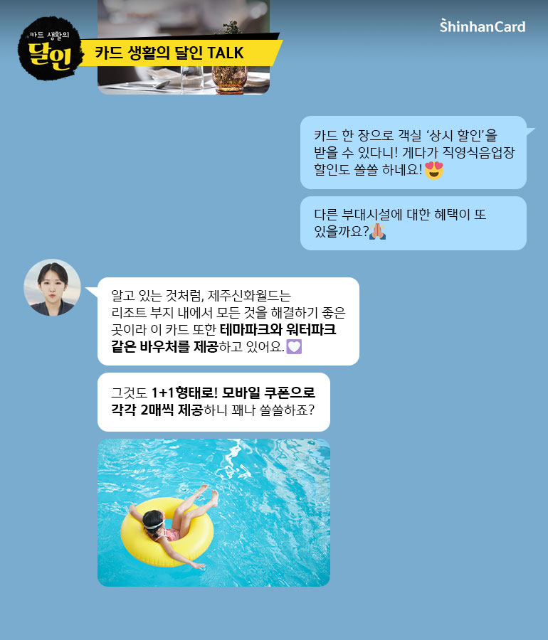 보통의 일상에선 야무진 혜택을 누리다가 제주에서 손쉬운 힐링으로 보상받게 하는 제주신화월드 신한카드! 반복되는 매일을 돌보는 나날과 매번 새로운 감각을 일깨워주는 여행의 순간에도 늘 함께 하겠습니다. 여행객 모두를 기분 좋게 만드는 ‘재주’를 가진 제주도에서 가장 멋진 진가를 발휘하는 제주신화월드 신한카드와 함께 진정한 제주 여행의 달인이 되보기로 해요 우리!