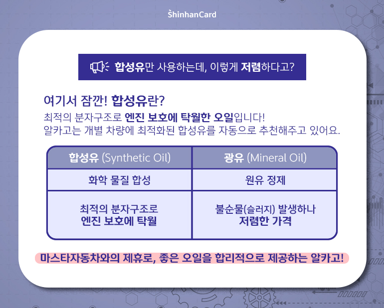 A. 최적의 분자구조를 통해 엔진 보호를 탁월하게 해주는 오일로, 알카고는 개별 차량에 최적화된 합성유가 자동추천 되는 기능을 지니고 있죠.