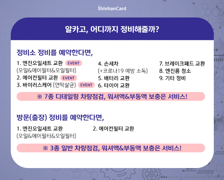 #신한카드 #알카고 #자동차정비 #엔진오일 #엔진오일교체 #자동차에어컨필터 #자동차정비어플 #워셔액 #차량점검 #손세차 #자동차검사 #자동차정기검사