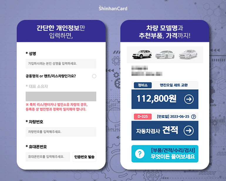 이름, 차량번호, 휴대폰번호만 입력하면 간편하게 가입할 수 있어요! 차량모델, 차대번호, 해당 차종에 적합한 표준부품 및 가격이 자동으로 표시됩니다. 자동차검사 만료일까지 알려주니 완전 편리 그 잡채!