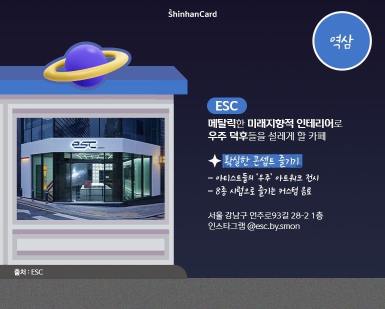 인테리어와 음료로 우주 콘셉트를 적극적으로 활용한 카페 ‘ESC’. 예전에 봤던 SF영화가 떠오를 만큼 공간은 영화 세트장을 방불케 하는데요. 여러 아티스트가 해석한 ‘우주’ 아트워크 전시도 관람할 수 있다고 하니, SF소설 한 권을 들고 ‘ESC’를 방문한다면 마치 우주선에 타 있는 듯한 기분이 들 것 같습니다.