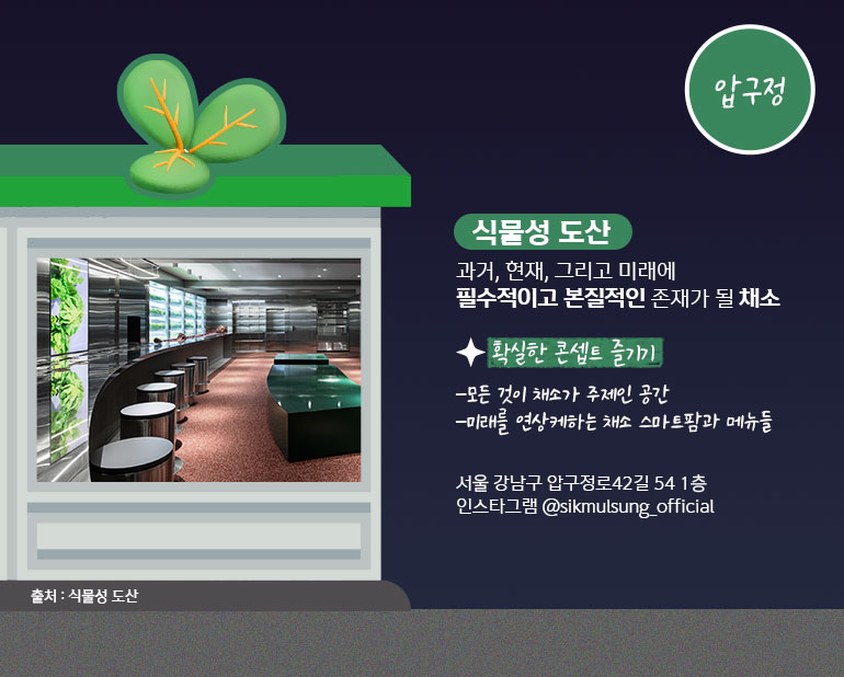 ‘식물성 도산’은 채소의 가치와 본질을 재조명하고자 하는 브랜드 ‘식물성’의 오프라인 공간입니다. 스마트팜 쇼룸이라고 할 수 있는 ‘식물성 도산’은 채소를 주제로 한 시그니처 메뉴, 브랜드 굿즈 등을 통해 음식이 식탁에 오르기까지 순환되는 과정을 한 곳에서 경험할 수 있어요.