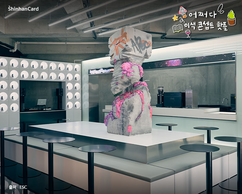 인테리어와 음료로 우주 콘셉트를 적극적으로 활용한 카페 ‘ESC’. 예전에 봤던 SF영화가 떠오를 만큼 공간은 영화 세트장을 방불케 하는데요. 여러 아티스트가 해석한 ‘우주’ 아트워크 전시도 관람할 수 있다고 하니, SF소설 한 권을 들고 ‘ESC’를 방문한다면 마치 우주선에 타 있는 듯한 기분이 들 것 같습니다.