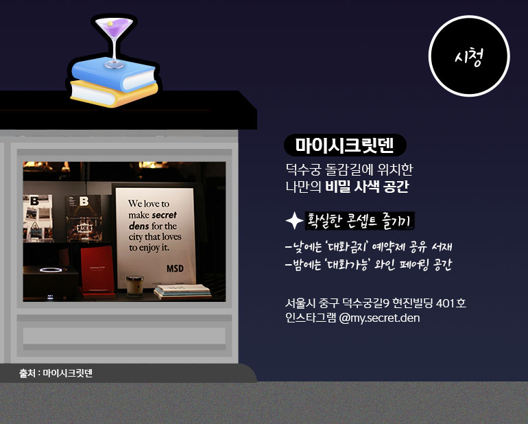 ‘마이시크릿덴’은 낮과 밤이 다른 모습으로 운영됩니다. 낮에는 예약제 서재로 운영되어 오직 자신에게만 집중할 수 있는 시간을 선사해줍니다. 밤에는 와인을 즐길 수 있는 와인 페어링 공간으로 운영됩니다. 일정 비용을 지불하면 좋아하는 음식을 가져와 즐기거나 주변의 맛집에서 음식을 배달해 먹을 수 있다고 하니, 혼자 또는 친구와 함께 와인을 즐겨보면 어떨까요?