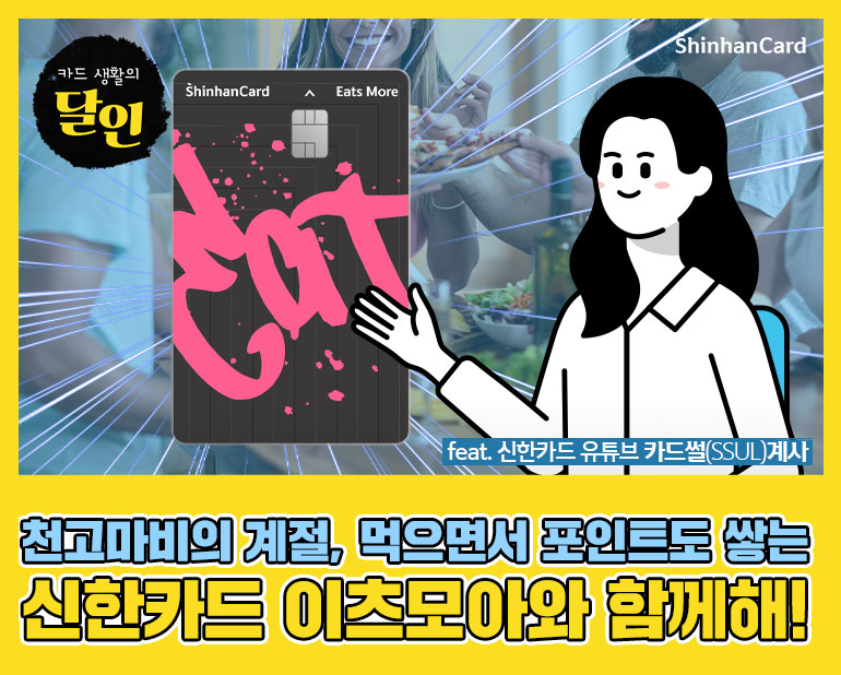 여러분은 특별한 날을 맞이하거나 기분 전환이 필요할 때 어떻게 하시나요? 쇼핑, 산책, 여행 드라이브, 여러 방법이 있겠지만 그중에서도 맛있는 음식을 먹으며 누리는 휴식만큼 쉬운 기분 전환이 있을까요? 바야흐로 천고마비의 계절, 똑똑한 먹깨비들을 위한 선택! 먹는 기쁨보다 더 큰 혜택을 누릴 수 있는 신한카드 이츠모아를 주목해 주세요!